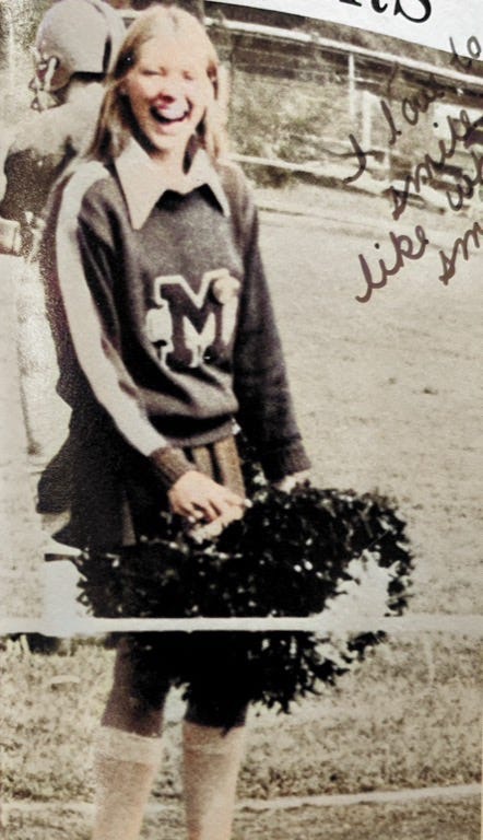 And from the Class of 1978, one student I’ll never forget: Debi Bell, Jeff’s sister, who I thought was beautiful, kind, and incredibly talented. She was a JV cheerleader, a top gymnast and volleyball player, and she even agreed to be my date for a few dances — mostly out of kindness… and brotherly loyalty. Jeff and I made every single game and practice of Debi’s. Yes, I had a big (unrequited) crush on Debi.