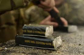 My favorite area of training was flame and explosives. The explosives range had bleachers with a corrugated aluminum roof overlooking a field dotted with bunkers built from huge timber ties. We learned to use detonation cord (det-cord, civilian primacord), which looks like green plastic clothesline but contains a PETN explosive core — wrap it around a tree four times and it will slice the tree in half when detonated. We trained with C-4, blasting caps, and the craft of incendiaries like napalm.